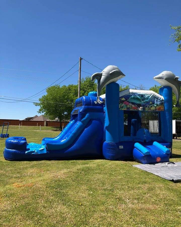 Book our slide bounce combo Dolphin Combo in All over oklahoma,nw arkansas, south west missouri, kansas for unforgettable parties. This dolphin themed combo pairs a roomy bounce area with a slide. It arrives cleaned, sanitized, and state inspected. Fast setup. Safe play. Perfect for birthdays, school events, and community gatherings.